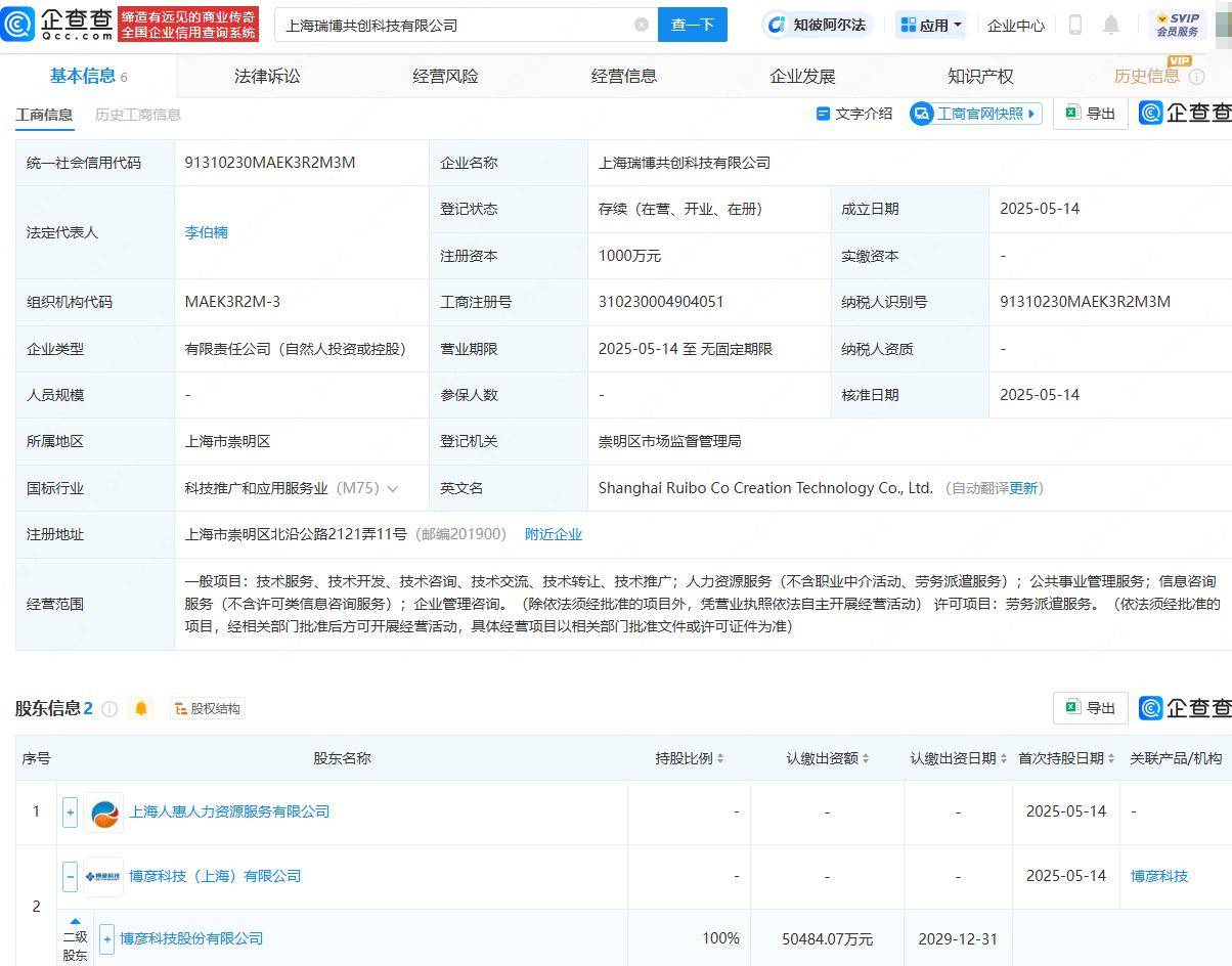 APP显示,近日,上海瑞博共创科技有限公司成立,法定代表人为李伯楠,注册资本为1000万元,经营范围包含:人力资源服务(不含职业中介活动、劳务派遣服务);公共事业管理服务;信息咨询服务(不含许可类信息咨询服务);企业管理咨询等。股权穿透显示,该公司由上海人惠人力资源服务有限公司、博彦科技(002649)旗下博彦科技(上海)有限公司共同持股。