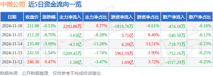 股票行情快报:中微公司(688012)11月18日主力资金净买入2293.88万元