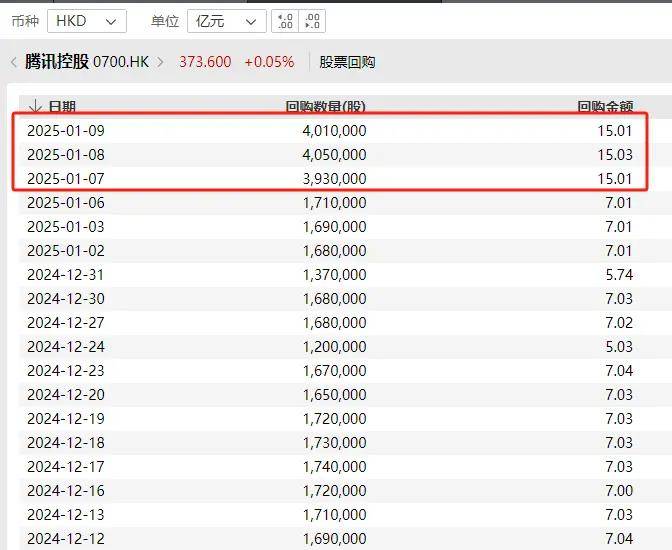 在股价回调之际,腾讯控股加大了回购力度。数据显示,从2025年1月7日开始,腾讯控股港股回购金额已连续3个交易日均保持在15亿元港元左右,较此前交易日的回购金额提升超过1倍。在此前的数个交易日,腾讯控股的日回购金额在7亿港元左右。