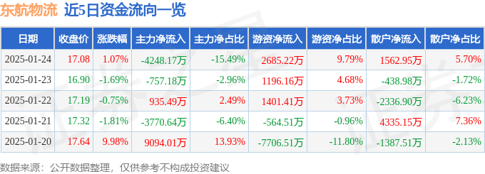股票行情快报:东航物流(601156)1月24日主力资金净卖出4248.17万元