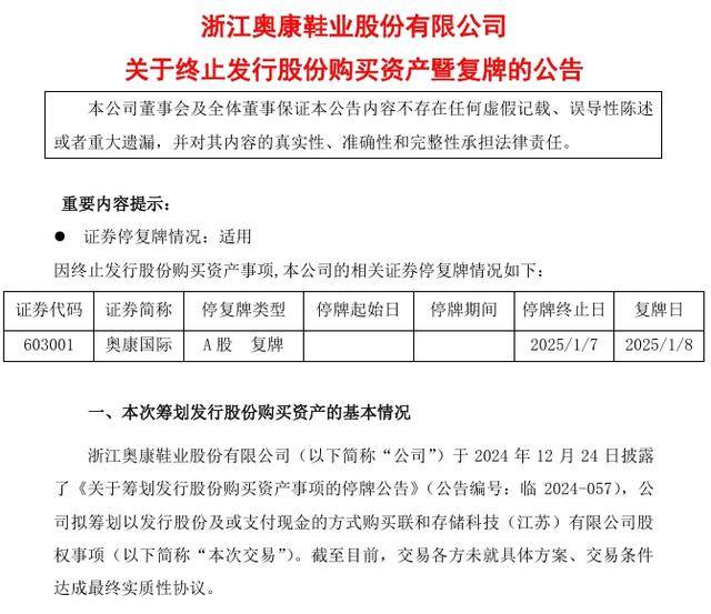 1月7日晚间,奥康国际发布《关于终止发行股份购买资产暨复牌的公告》。公告中称,终止的原因是交易各方对交易方案进行多轮协商和谈判后,对本次交易的最终交易条件未能达成一致。公司股票将于2025年1月8日开市起复牌。