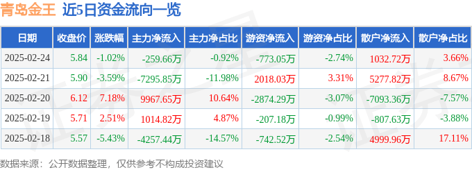 股票行情快报:青岛金王(002094)2月24日主力资金净卖出259.66万元